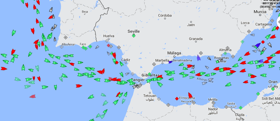 说到西班牙海岸,看看所有进出地中海的船只: