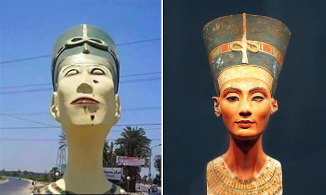 但在埃及却不是这样。也许是受到近期示威和政治变革的鼓舞,埃及人抗议一座荒谬的雕塑并将其拆除。这件“艺术品”原本是位于柏林新博物馆(Neues Museum)的古埃及女神娜芙蒂蒂(Nefertiti)半身像的复制品。它被委托竖立在开罗以南三小时车程的萨玛鲁特市的入口处。