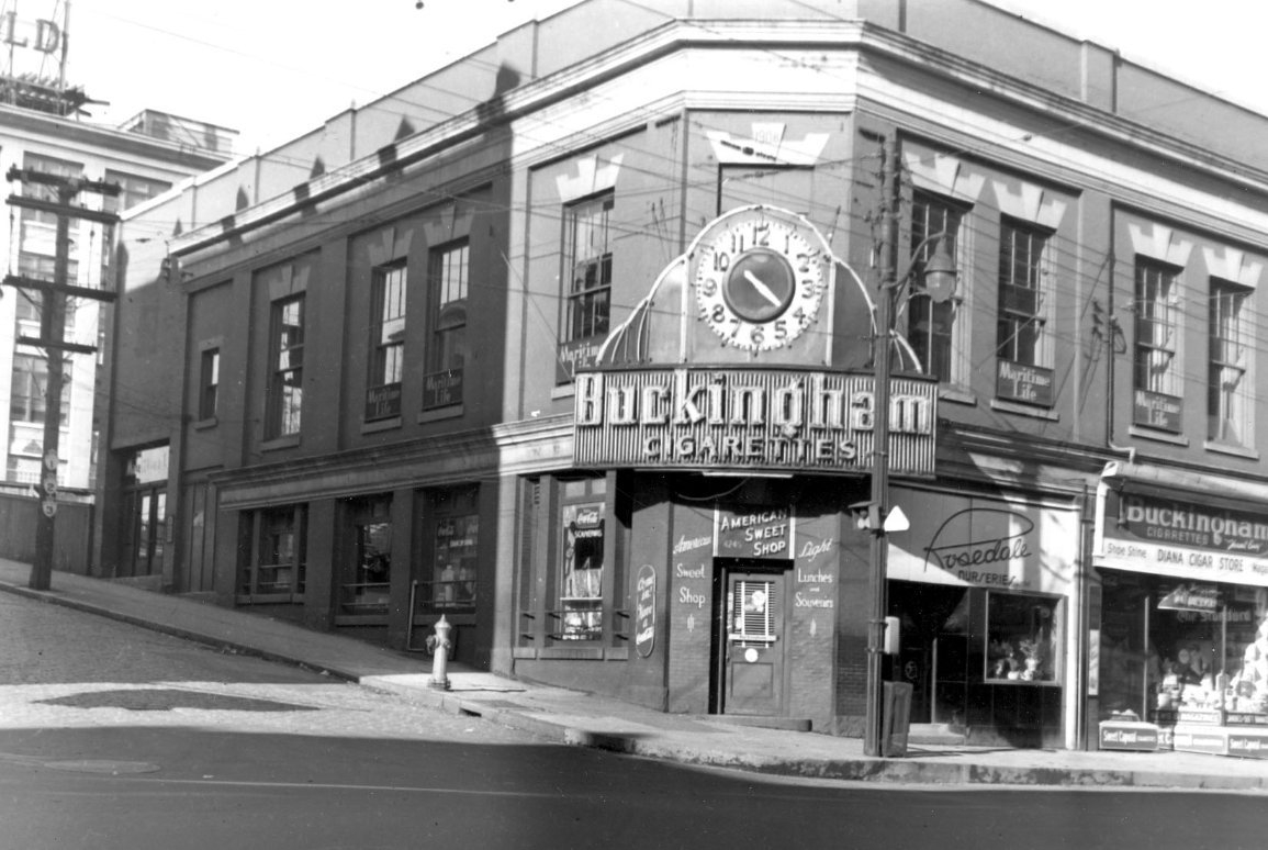 美国的糖果店。哈利法克斯市政档案馆,CR2-04。这是众多例子中的一个注意到阿奇博尔德这座位于萨克维尔和巴林顿的建筑以“时间和香烟的巨大庆典”为特色,在1962年被加拿大永久建筑取代,现在星巴克就在它的一楼。