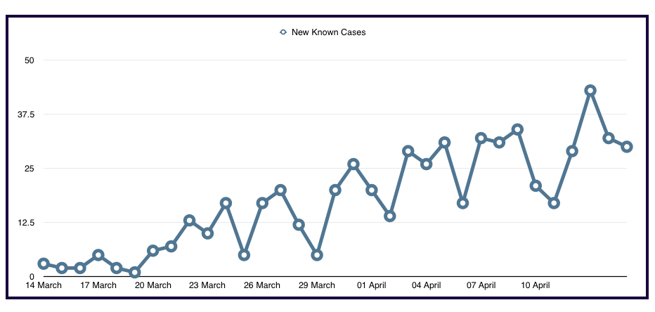 这是截至日期新已知病例的图表。通过线仍在展望,但不是非常如此。