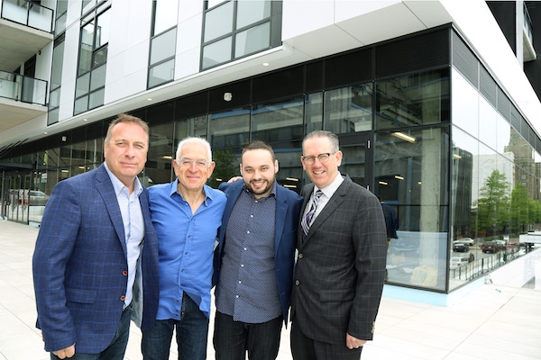 从左起,交易所的罗伯特·摩尔,西南地产董事长兼首席执行官吉姆·斯帕茨,交易所的贾斯汀·加兰,西南地产总裁兼首席运营官戈登·莱恩在枫酒店新餐厅的露台上。