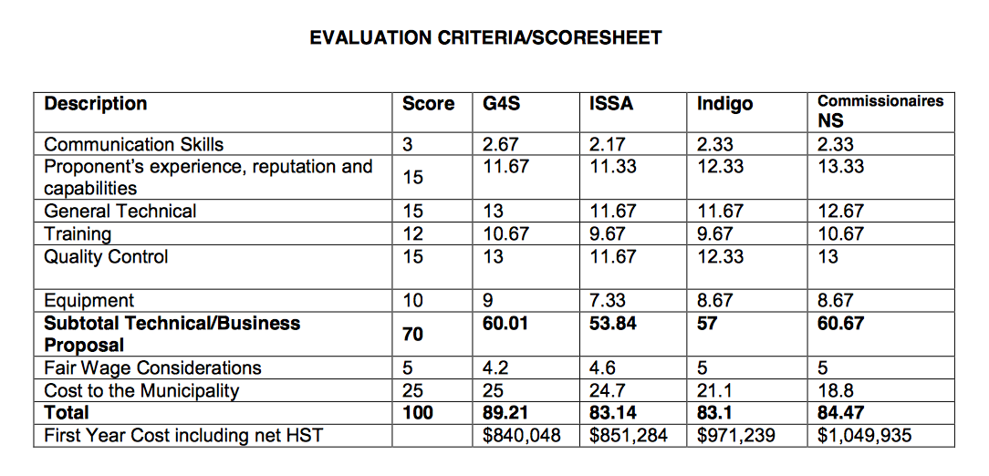有四家公司符合投标条件:Indigo、ISSA、G4S和Commissionaires Nova Scotia。议员们表达了不同的偏好。有些人,比如马特·惠特曼(Matt Whitman)说,合同应该交给ISSA,因为这家公司有经验。而像格洛丽亚·麦克卢斯基(Gloria McCluskey)这样的其他人则喜欢委员们,因为他们为退休的兽医提供了一份体面的工资。还有一些人,像Waye Mason,认为如果只关注成本,合同将导致过度激进的停车执法。