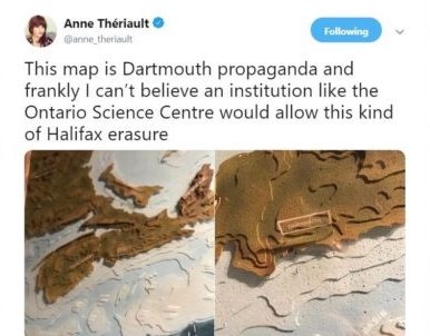 周末,安大略作家兼作家安妮·特里奥特在推特上发布了这张来自安大略科学中心的地图照片,其中达特茅斯是新斯科舍省唯一被强调的城市。对特里奥特的推文的一些回复说,这一定是格洛丽亚·麦克卢斯基的作品。