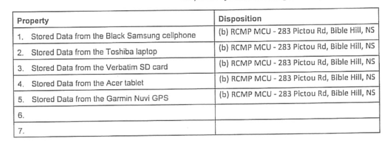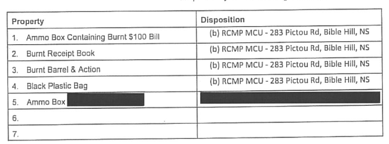 在200个Portapique Beach Road物业中扣押了几项,包括一个弹药盒,其中烧焦了100美元的钞票,收据书,一些枪零件和一个内容的弹药箱。