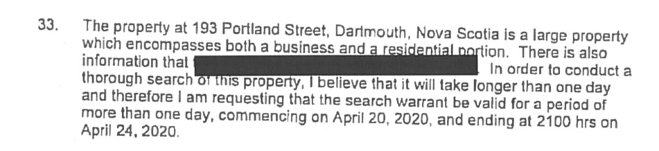 与此授权相关的ITO是获得的ITO上周考官。这张搜查令本质上与乔治·w·乔治·华盛顿大学Portapique地产的搜查令(上述名单上的第一张)相同,但进行了修改,允许搜索遗体。此外,和平法院法官艾莉森·罗斯(Allison Rose)发布了“相关援助令”,允许挖掘公司进入现场。