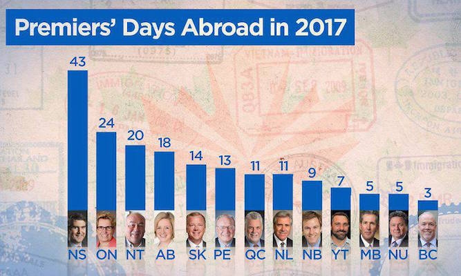 “2017年,加拿大最小省份之一的省长国际旅行最多,他在加拿大以外的政府旅行超过一个月。”报告Marieke Walsh为Global: