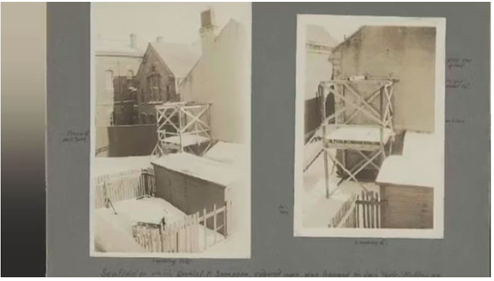 从照片中判断,绞鞋是一种摇摇欲坠的结构,具有架空光束,可能是悬挂的绞索。难以理解的尺寸很难,似乎没有陷阱门,所以我不知道实际执行的执行。