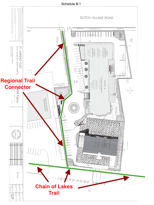The applicant has requested a non-substantive amendment to recognize and allow for the relocation of the Regional Trail Connector walkway to the south side of the property. The walkway connects to the Regional Trail (“Chain of Lakes Trail”) which abuts the subject property on the Joseph Howe Drive frontage. Schedule B of the existing development agreement (Attachment B) showed the location of the Regional Trail Connector walkway as an active transportation pathway through the development on the north side of the property. This provides a mid-block connection between Joseph Howe Drive and Dutch Village Road. During construction, challenges with topography and building design resulted in relocation of the walkway to the south side of the property.