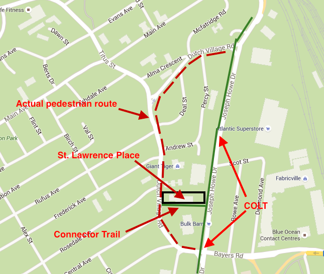 Which leads to the third thing on the map: the inclusion of a “regional trail connector” in the development, which, in the planners’ words, “provides a mid-block connection between Joseph Howe Drive and Dutch Village Road.” But this mid-block connector serves just one possible destination: the Superstore. Even to get to the Superstore, the connector saves just one block. Anyone wanting to walk further north along Joseph Howe could follow Dutch Village Road in front of Mexico Lindo and Freeman’s up to Joseph Howe; anyone wanting to walk south would walk along Dutch Village Road, past St. Lawrence Place to the intersection of Bayers Road and Joseph Howe. The sidewalk along the street, not the trail, is the main walking route. And to be sure: there’s lots and lots that can be done to improve the pedestrian experience while walking along Dutch Village Road, but those improvements should’ve started with a nice pedestrian-friendly streetscape in front of St. Lawrence Place.