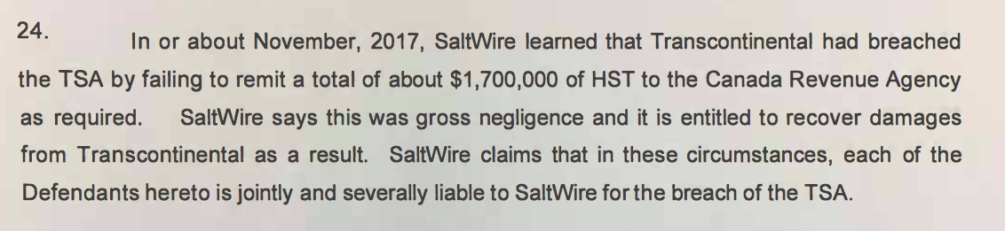 还有其他关于资产价值低于横贯大陆所陈述的主张,还有一项税收主张:SaltWire声称横贯大陆留下了一笔170万美元的未付HST账单。