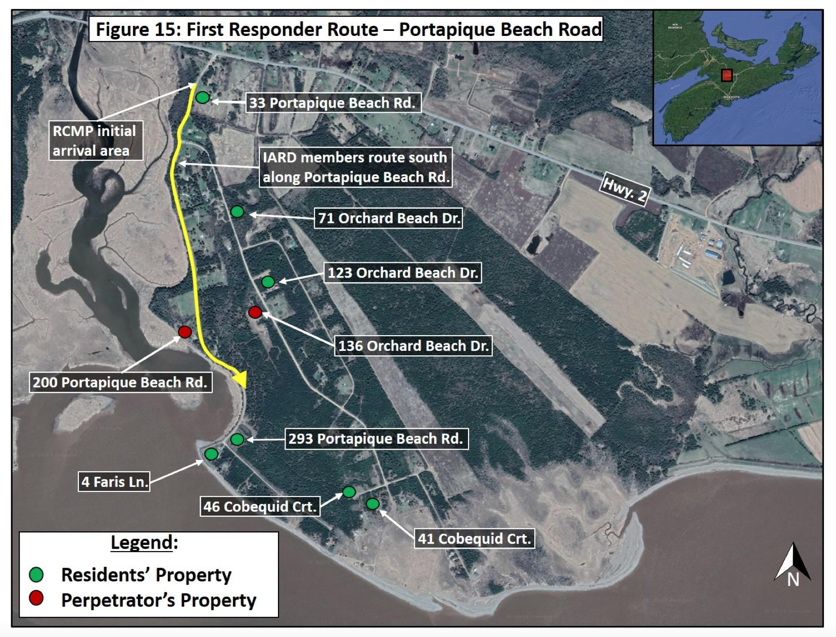 IARD小组进入Portapique的路径(黄色)。地图:MCC / Brian Corbett