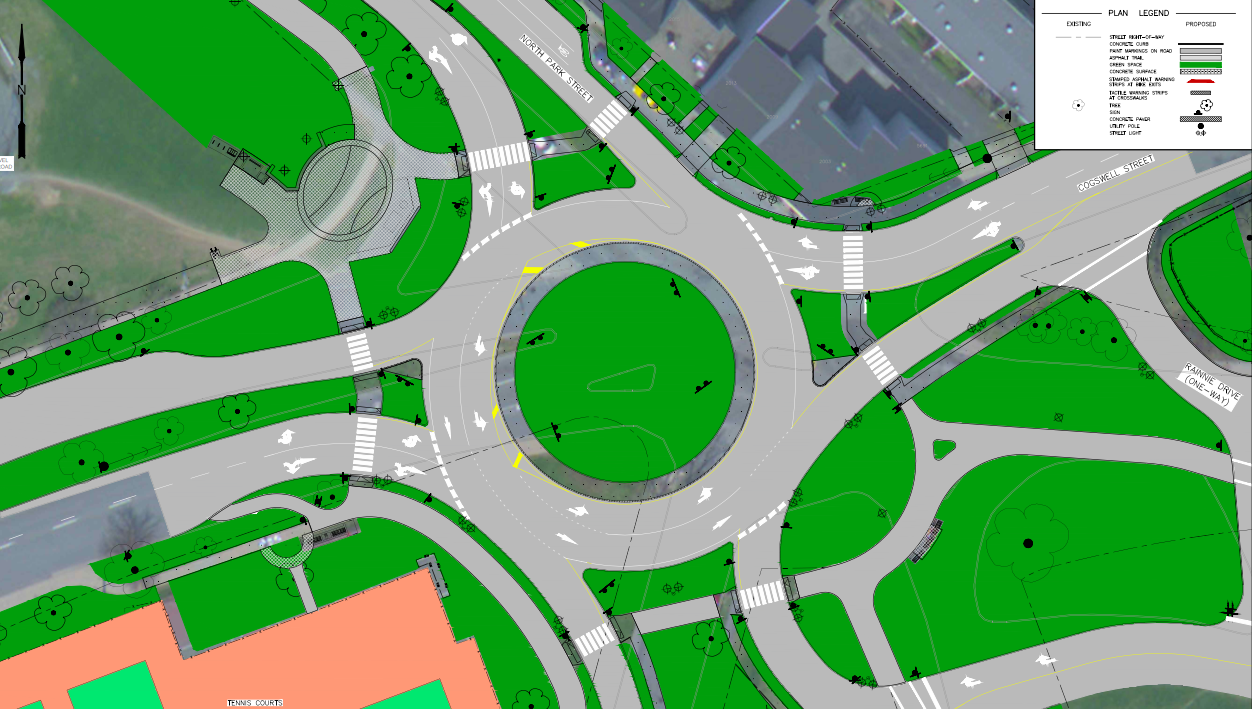 这个十字路口是行人在北端和南端之间行走的主要路线,沿着Citadel Hill的西边。目前,这些行人必须等待通过两辆轻型自行车——一辆在考斯韦尔街,另一辆在兰尼街——所以环岛将是一个巨大的改善。这也将为司机澄清混乱的转弯车道。