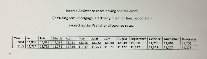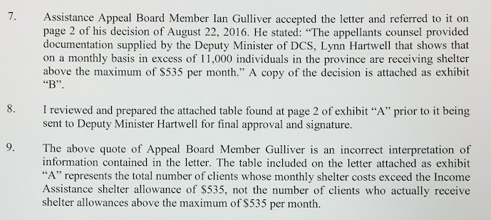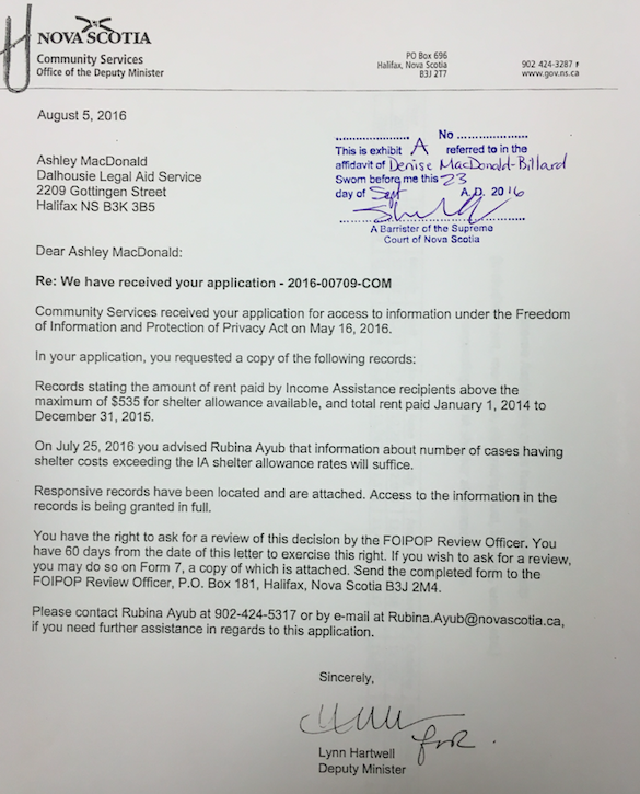 协助艾伦上诉的一名学生法律援助工作者阿什利·麦克唐纳(Ashley MacDonald)向社区服务处提交了一份信息自由申请,要求提供司法部支付超过《就业支持和收入援助条例》(Employment Support and Income Assistance regulations)所允许的535美元住房补贴的案例数量。Lynn Hartwell,社区服务部副部长,发了以下一封信作为回应: