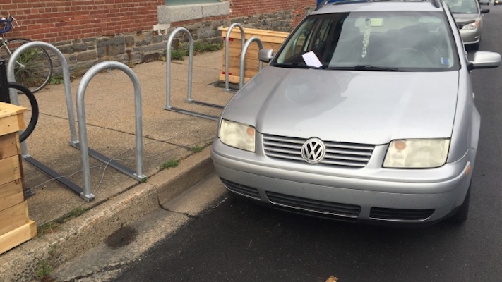 莱恩说,自行车围栏在五天内被移到人行道上三次。她说,几乎每次都有一辆银色的大众旅行车停在原地。