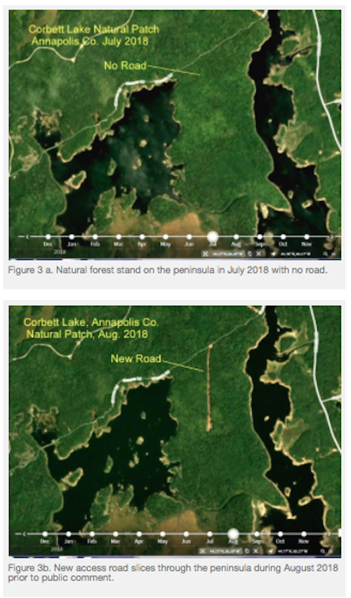 许多市民和安纳波利斯县议会立即开始准备提交对这一提议收获的意见。我们邀请了18名居民实地参观拟议的两阶段清拆工程。到达现场后,他们发现了一条750米长的大道路,沿着天然半岛的中心建造。(图3 a-b[上图])。他们还发现,第一阶段的收割已经开始了。市民实地考察还发现了许多散落的非常大的古木阔叶树和其他生态、风景、娱乐特色,是一个半岛之间的两个湖泊。