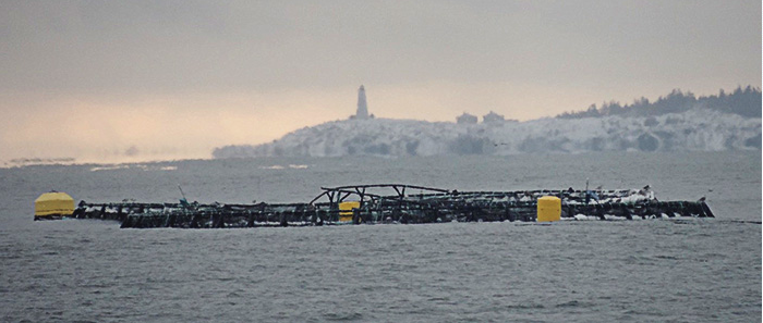 Cooke水产养殖的乔丹海湾网站在2018年初风暴。照片Kathaleen Milan和Ron Neufeld,来自Asf.ca