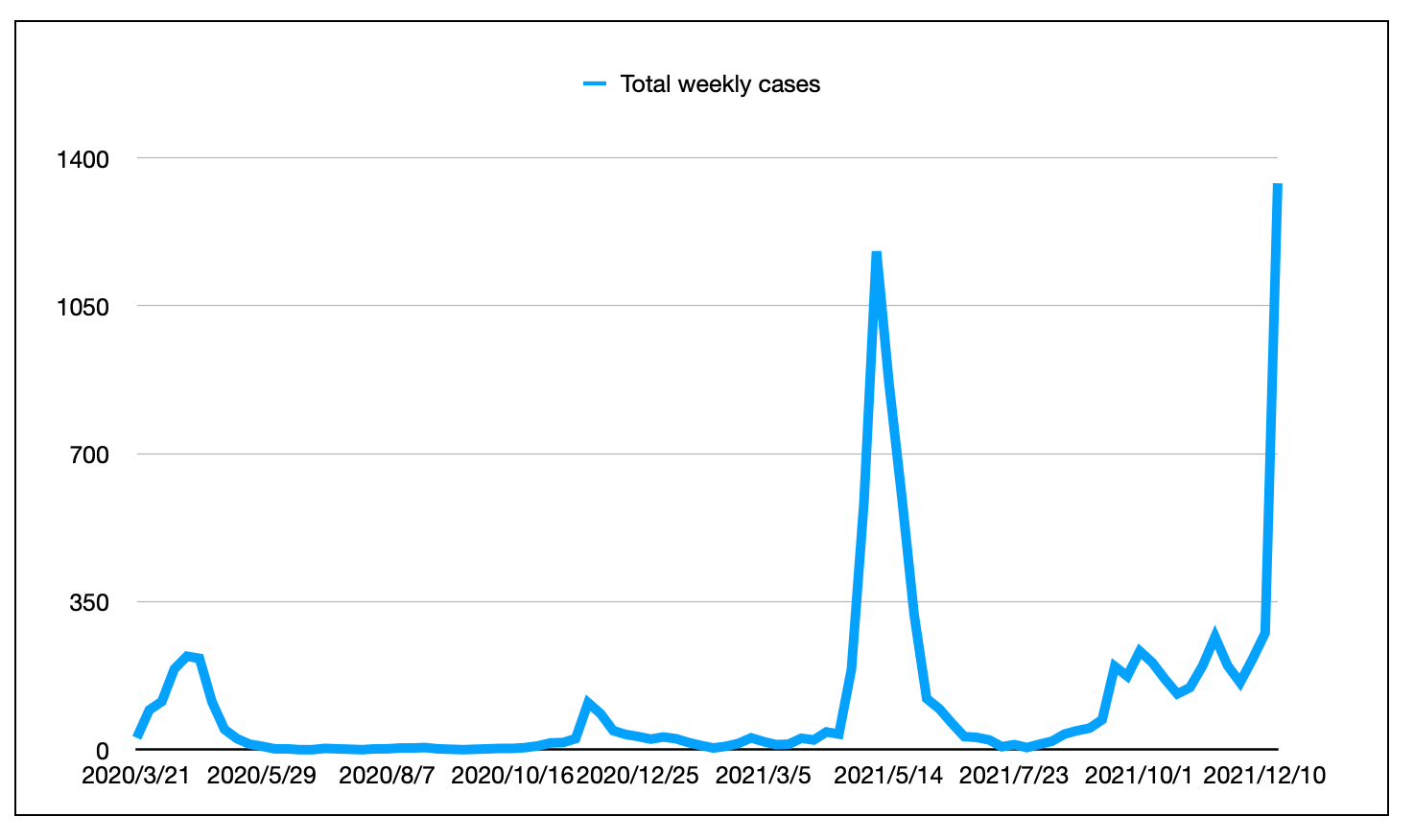 在大流行期间,新斯科舍省每周(星期六至星期五)新增病例计数。