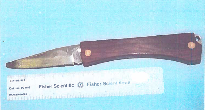 1996年哈利法克斯警方拍摄的这把刀的照片,在1999年格伦·阿桑因谋杀布伦达·韦的审判中被出示。(Fisher Scientific是一家实验室公司,对这把刀进行了血液、指纹、DNA或其他可能将其与谋杀案联系起来的证据的检测;它没有找到。)
