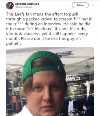 4月22日CTV多伦多记者米兰达华丽斯被一名叶子粉丝接近,他在她身上大喊大叫,“她就在P ****”。在Tweet Anthistle说这会发生一次每月一次。这种特殊的粉丝认为它是搞笑的,叶子管理有一个声明说它不会达到这种行为。但Lowe说团队和球员需要做更多。