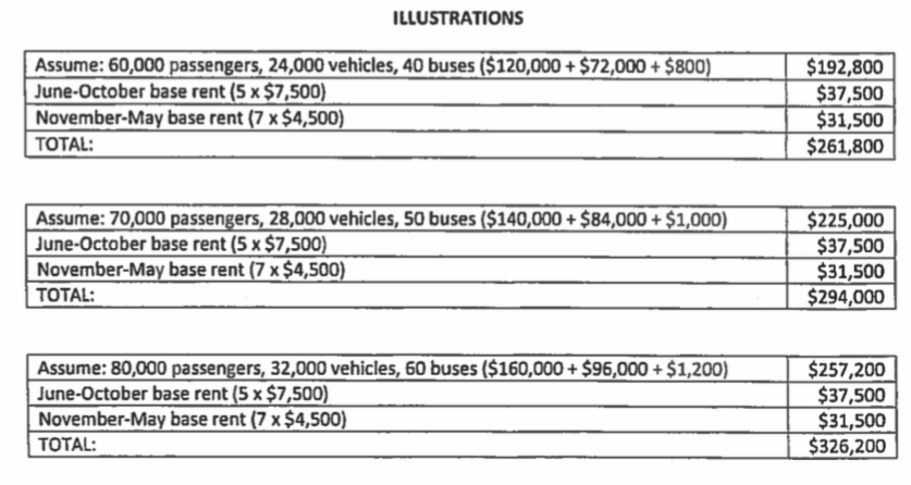 也就是说,AFS在非运营月份以4500美元的价格租赁这些设施,在运营月份以7500美元的价格租赁这些设施。预计运营月份为6月至10月,如果渡轮整个月都没有运营,当月的租约将按比例计算。此外,AFS将向每位乘客支付2美元,每辆车支付3美元(未确定),每辆巴士支付20美元。与之前与波特兰市的租约不同,摩托车没有折扣费用。租约提供了这些说明性场景:
