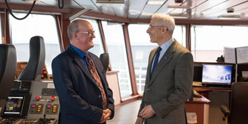 首席执行官特伦斯·保罗和克利尔沃特首席执行官伊恩·史密斯在蛤蜊船安妮·里斯利号上拍照。