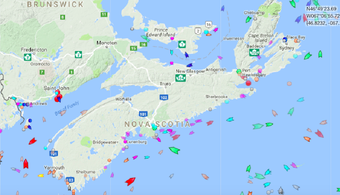 周五上午9点20分,新斯科舍附近海域。地图:marinetraffic.com