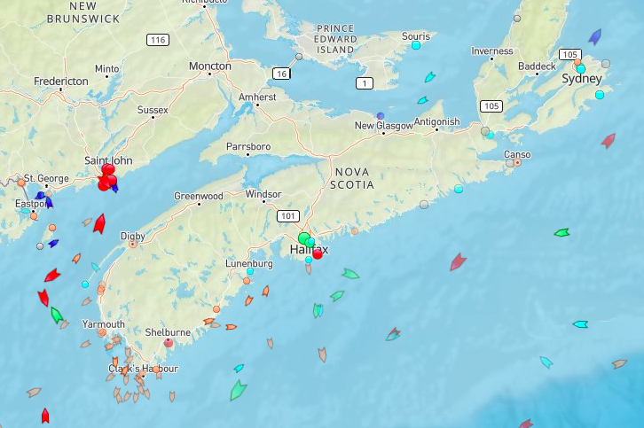 早上7:Oceanex三趾鹬的滚装船集装箱从圣约翰港抵达41号码头