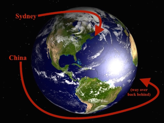 全球地图显示了从中国到北美的壮观的航运路线,但错过了通过加宽的巴拿马运河的捷径(部分资金来自中国!)