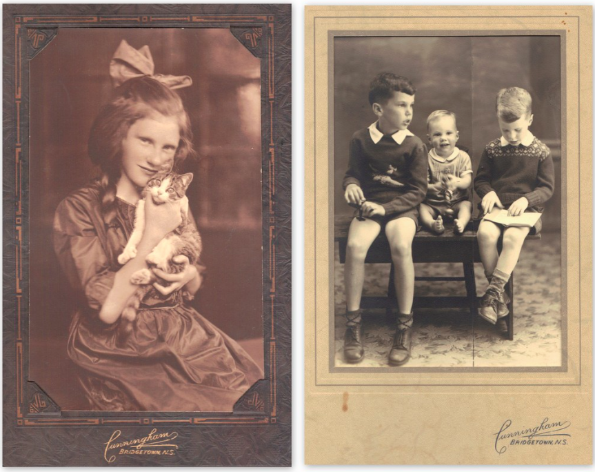 左边是我母亲在1923年的肖像。在去拍照的路上,她在街上发现了这只小猫,并把它带到了乔治的工作室。Georgie也给我和我的兄弟们拍了很多照片。她用的是一个可以拍8 × 10底片的大视角相机。我记得她会躲在遮光布后面调整焦距。我在这张大约1948年的照片的中央。