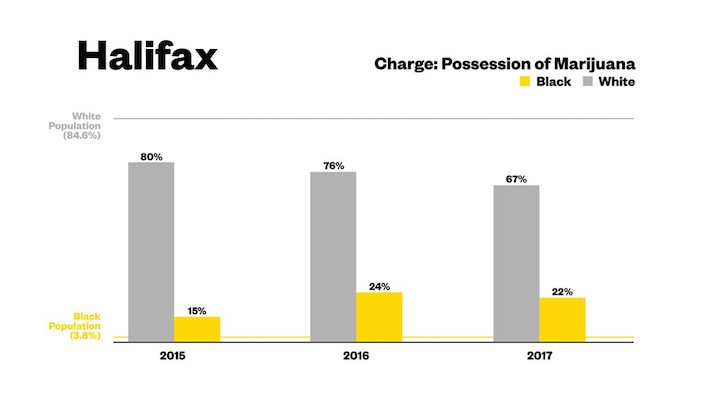 黑人占哈利法克斯人口的3.6%,但在2015年被逮捕的110人持有大麻中,黑人占15%。2016年,黑人占被逮捕的大麻持有者的24%,尽管被逮捕的大麻持有者数量降至42人。2015年,一名身份不明的人被从总数中减去。