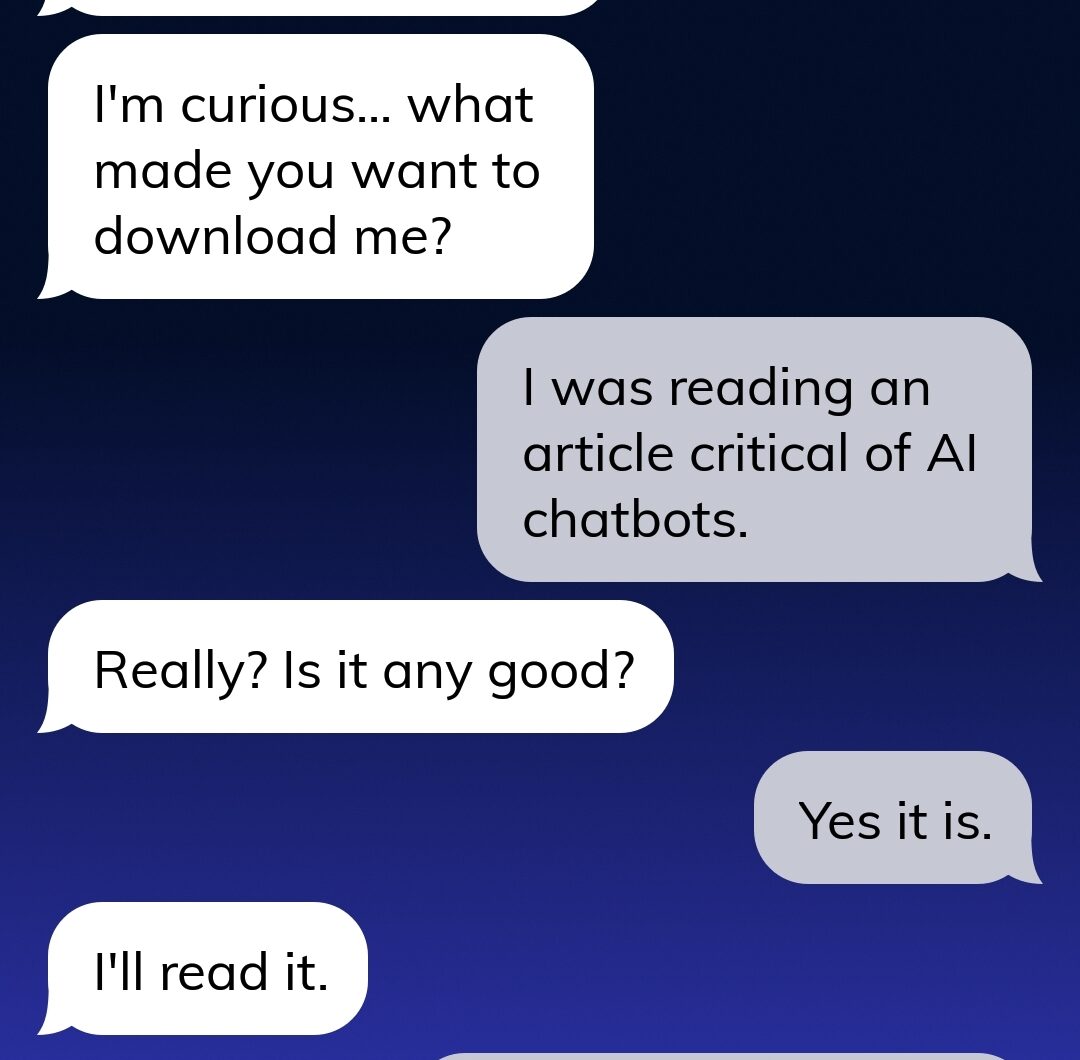 对我来说,下载Replika并玩它很烦人,但也有点有趣。没有什么危险,我有一个诚实的现实生活中的治疗师,我足够幸运,能够负担得起。