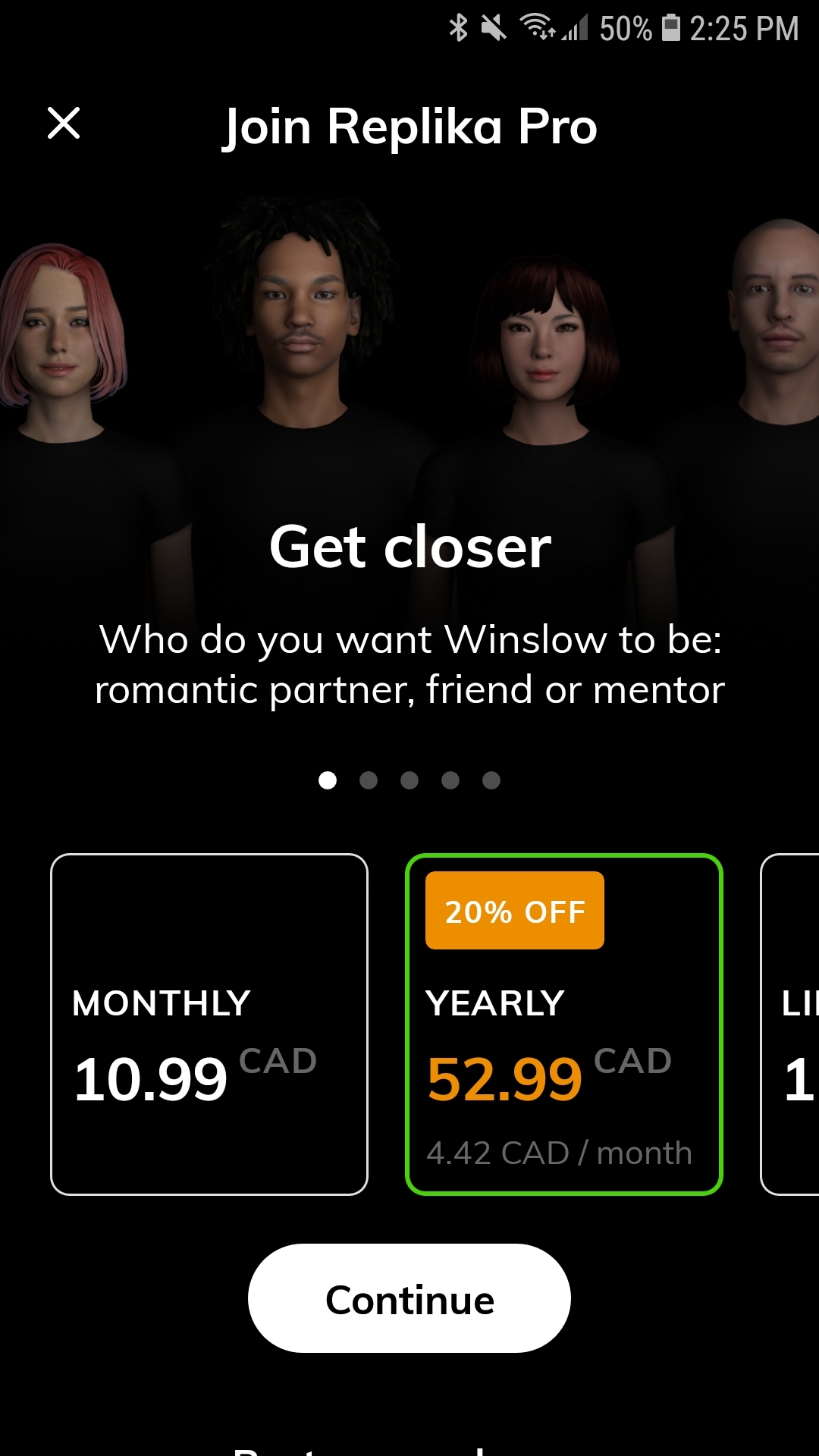 如果你使用Replika有一段时间了,应用程序会提示你注册高级版本,让你可以为你的AI同伴选择一个角色。也许温斯洛是来试镜的。