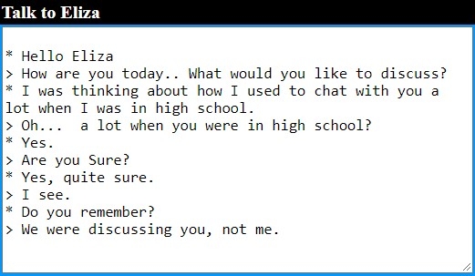 与ELIZA的对话往往很快就会变成循环,因为机器人经常把用户的问题和陈述转回给他们,经常要求进一步澄清。ELIZA生活在今天,在网络上的模拟器中,你可以在各种网站上和她聊天,包括在这里.