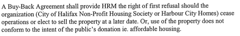 居住在海港城公屋待售房屋的租户表示,政府在将物业转让给海港城公屋时,有回购条款。昨天,我研究了这个建议,发现事实上哈利法克斯议会同意在2007年销售2275不伦瑞克街,规定之一是: