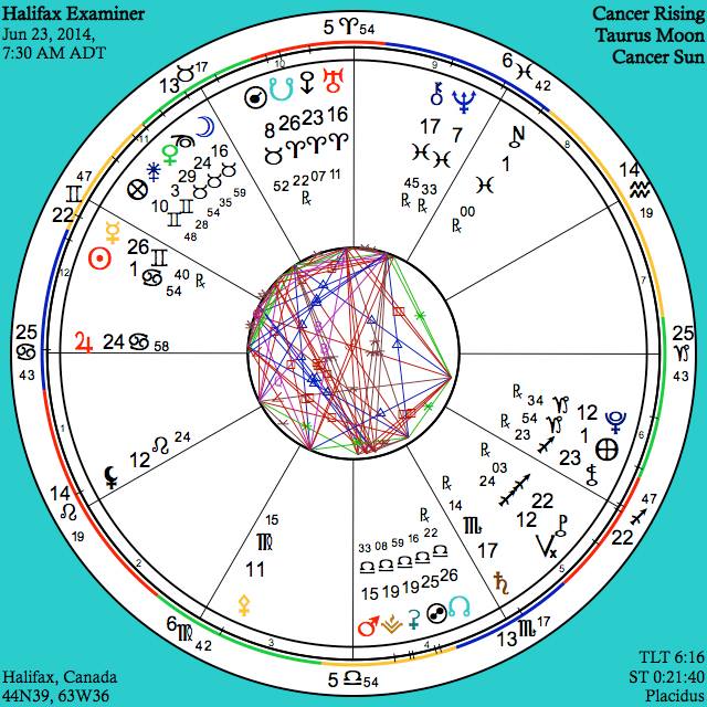 我把出生时间给了审查员和占星家阿里尔哈珀殿,她说主考人的星象图: