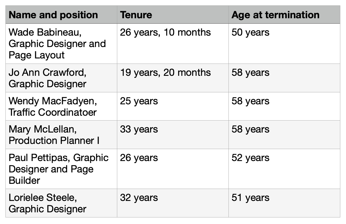 在2020年3月24日 - 当天斯莱特在哈利法克斯被裁掉 - 六名夏洛特敦五名雇员的被无限期下岗由于大流行(麦克菲迪恩是个例外,因为她是在短期残疾休假的时间)。正如斯莱特在哈利法克斯,夏洛特敦裁员作了永久2020年7月23日,9月1日生效,但不像斯莱特,谁是通过9月1日支付,根据法院的要求,没有夏洛特敦员工进行了3月24日支付后,除了应计薪酬和假期工资,以及“SaltWire告知每一个就业已经受挫COVID-19的申请人。”