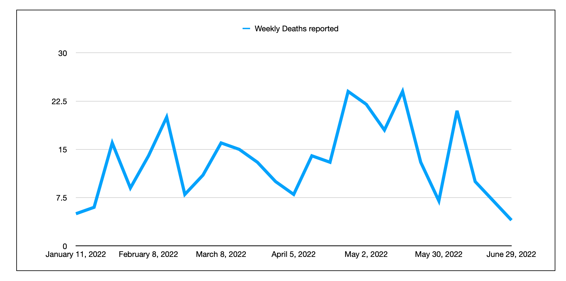 自1月以来,新斯科舍省每周的COVID死亡人数。请注意,由于报告期间的变化,截至4月11日的一周只有6天。