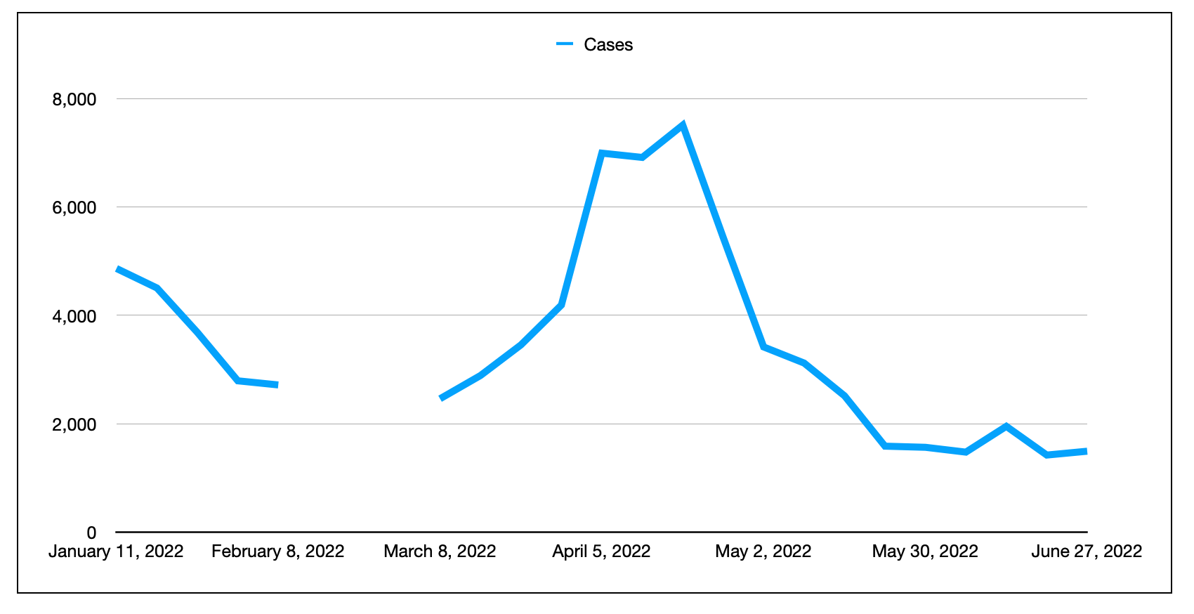 1月份每周实验室确认的(PCR检测)新病例数。这一差距反映了测试方案的临时变化,使得每周的比较变得毫无意义。由于报告周期的变化,截至4月11日的一周只有6天。