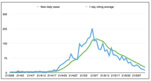 想看看一张漂亮的照片吗?从第三波开始以来,查看新案例的图表跟踪新案例编号和新星斯科舍的七天滚动平均值: