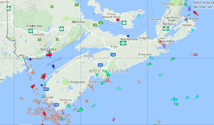 周三上午9点40分,新斯科舍附近海域。地图:marinetraffic.com