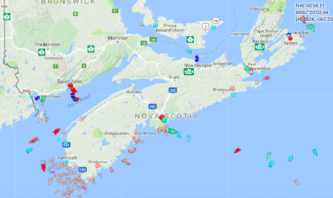 周四上午9点,新斯科舍附近海域。地图:marinetraffic.com