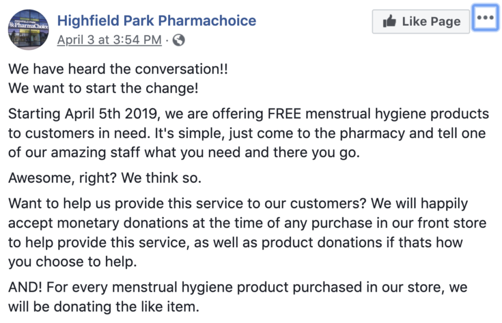 她向店主大卫·恰森(David Chiasson)提出了为有需要的顾客提供产品的想法,后者告诉她去做吧。她与员工讨论了这个想法,员工们想出了顾客可能需要的产品的想法,包括可重复使用的杯子和棉垫。现在,Pharmachoice将承担费用,他们会匹配顾客的购买,但也接受捐赠。