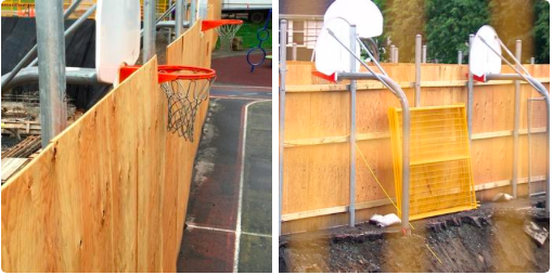 但有一个大问题:这堵墙挡住了圣约瑟夫麦凯学校(St. Joseph 's A. McKay School)旁边球场的一端,一直延伸到篮球网下面。