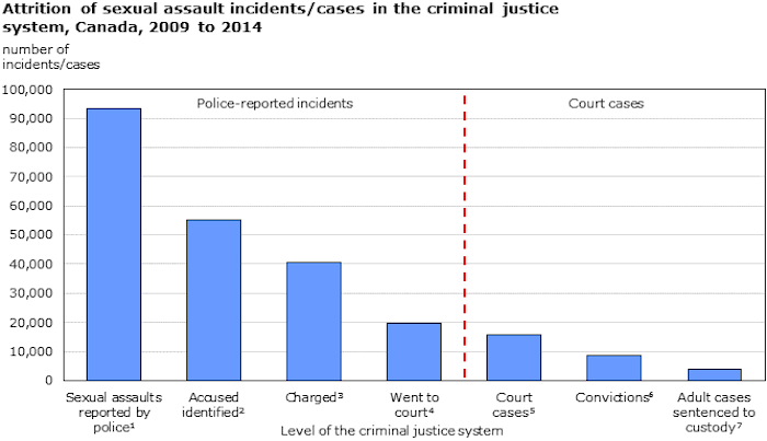 - 在警方报告的性侵犯案件中,60%的案件都有被告,其中69%被指控。总的来说,只有不到一半(41%)的警察报告的性侵犯导致了指控,相比之下,一半(50%)的身体侵犯导致了指控。