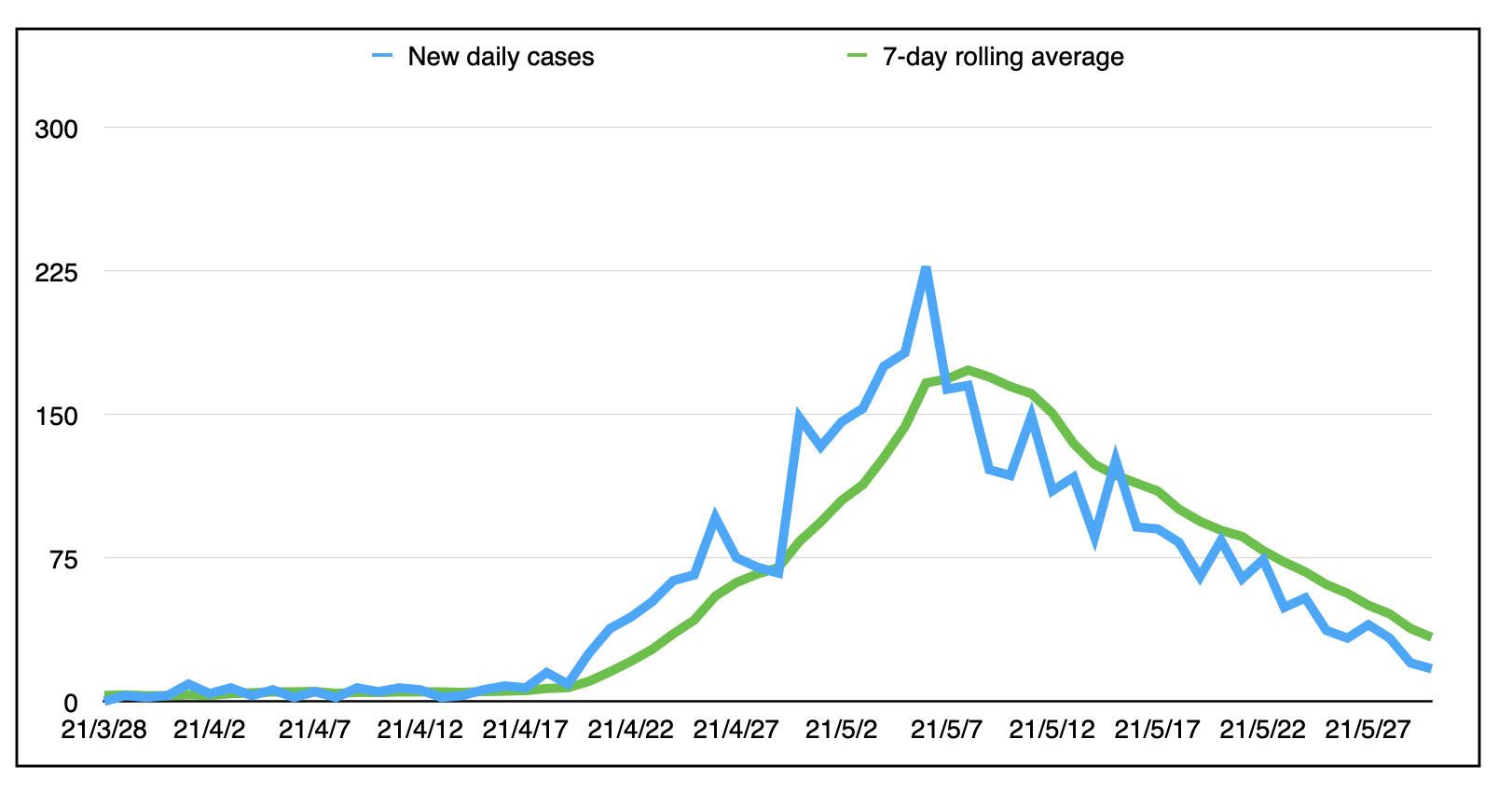 新天的Covid-19案例和7天汇率从3月28日至5月27日,新的每日Covid-19案例