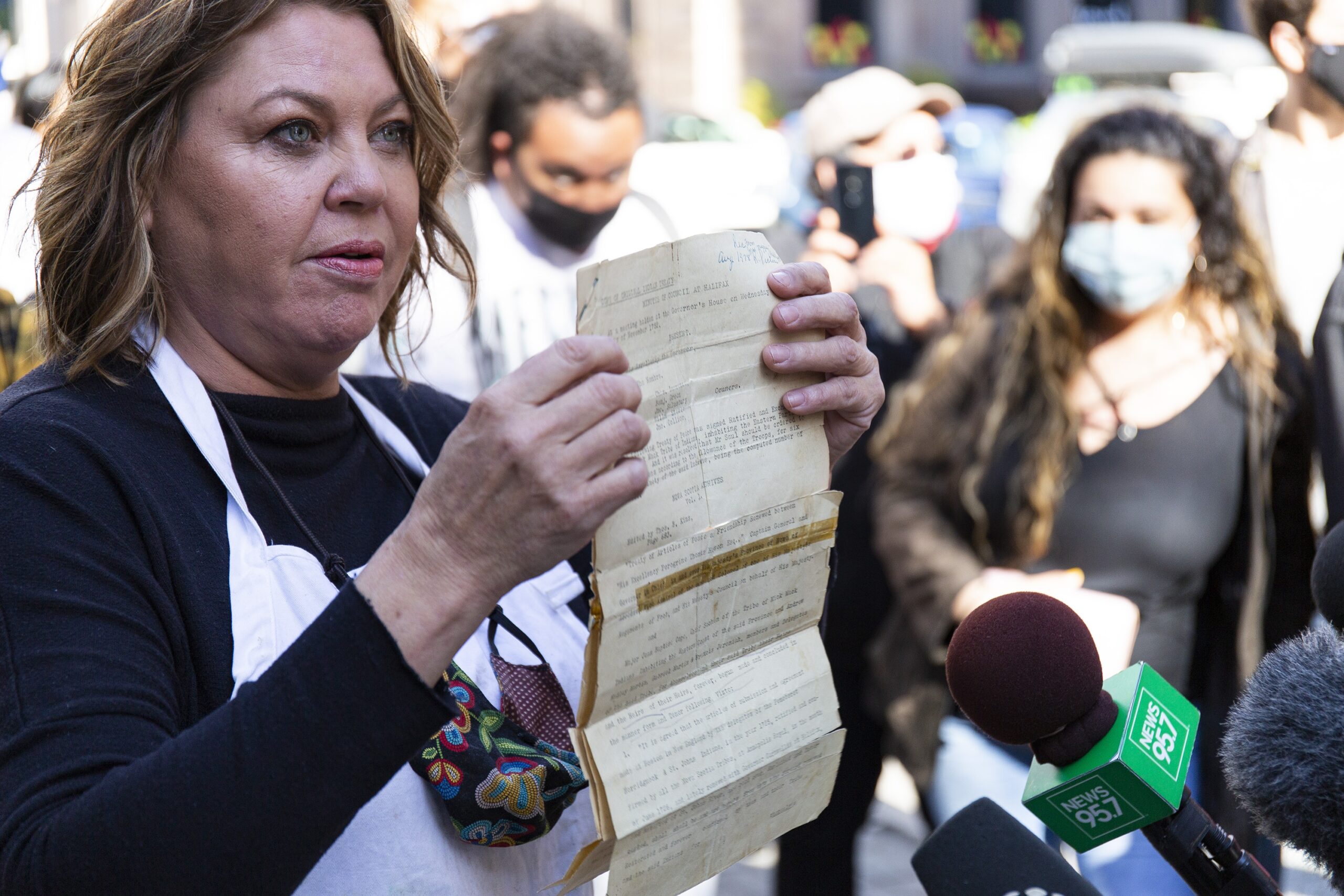 2020年10月16日,周五,谢丽尔·马洛尼(Cheryl Maloney)在哈利法克斯省议会大厦前举起她阿姨的《1752年条约》副本。照片:赞恩伍德福德