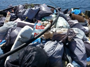 2014年,麦克纳布斯岛一年一度的海岸线清理活动中,从海岸上收集的一堆垃圾。