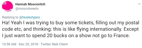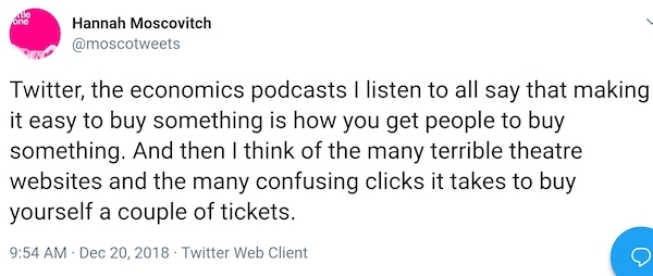 在圣诞节之前,剧作家汉娜·莫斯可维奇(我们没有血缘关系,虽然我写过她的故事)发了几条关于在网上买戏票的推文。