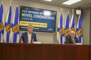 2020年5月13日星期三,总理斯蒂芬·麦克尼尔(左)和卫生首席医疗官罗伯特·斯特朗博士在COVID-19通报会上。图片来源:新斯科舍省通讯公司