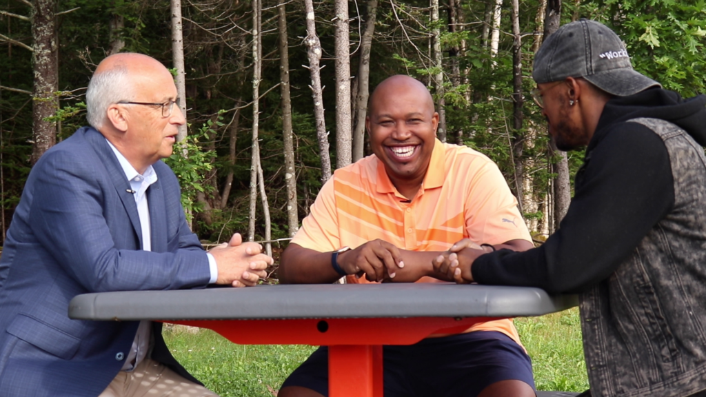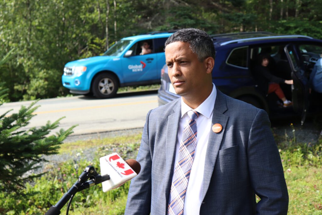NDP领导者加里伯里尔,NDP普雷斯顿候选人辛蒙兹和社区活动家Quentrel Provo讨论了樱桃布鲁克的竞选街道检查。照片;马修Byard.